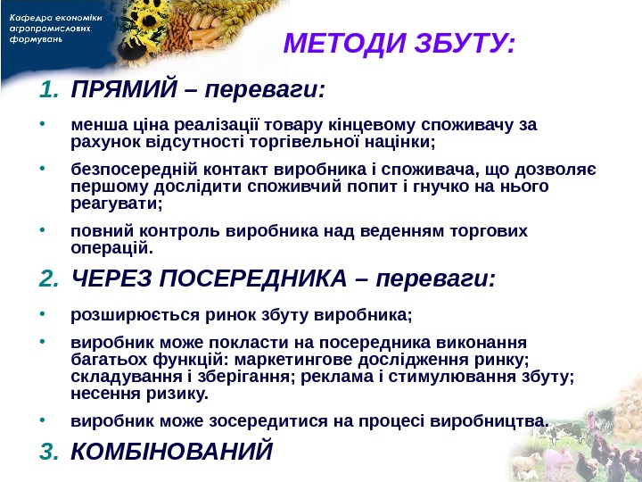 МЕТОДИ ЗБУТУ: 1. ПРЯМИЙ – переваги: • менша ціна реалізації товару кінцевому споживачу за рахунок відсутності торгівельної націнки; • безпосередній контакт виробника і споживача, що дозволяє першому дослідити споживчий попит і гнучко на нього реагувати; • повний контроль виробника над веденням торгових операцій. 2. ЧЕРЕЗ ПОСЕРЕДНИКА – переваги: • розширюється ринок збуту виробника; • виробник може покласти на посередника виконання багатьох функцій: маркетингове дослідження ринку; складування і зберігання; реклама і стимулювання збуту; несення ризику. • виробник може зосередитися на процесі виробництва. 3. КОМБІНОВАНИЙ