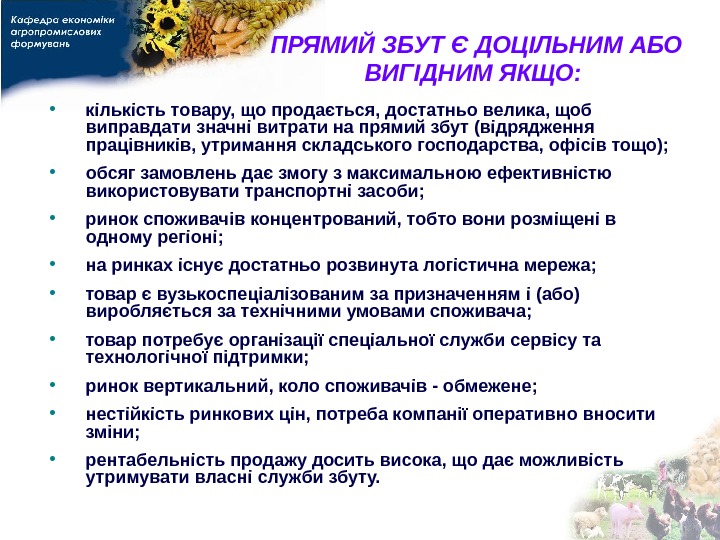 ПРЯМИЙ ЗБУТ Є ДОЦІЛЬНИМ АБО ВИГІДНИМ ЯКЩО: • кількість товару, що продається, достатньо велика, щоб виправдати значні витрати на прямий збут (відрядження працівників, утримання складського господарства, офісів тощо); • обсяг замовлень дає змогу з максимальною ефективністю використовувати транспортні засоби; • ринок споживачів концентрований, тобто вони розміщені в одному регіоні; • на ринках існує достатньо розвинута логістична мережа; • товар є вузькоспеціалізованим за призначенням і (або) виробляється за технічними умовами споживача; • товар потребує організації спеціальної служби сервісу та технологічної підтримки; • ринок вертикальний, коло споживачів — обмежене; • нестійкість ринкових цін, потреба компанії оперативно вносити зміни; • рентабельність продажу досить висока, що дає можливість утримувати власні служби збуту.