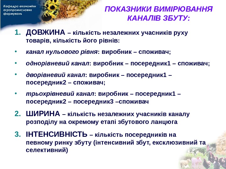 ПОКАЗНИКИ ВИМІРЮВАННЯ КАНАЛІВ ЗБУТУ: 1. ДОВЖИНА – кількість незалежних учасників руху товарів , кількість його рівнів: • канал нульового рівня : виробник – споживач; • однорівневий канал : виробник – посередник 1 – споживач; • дворівневий канал : виробник – посередник 1 – посередник 2 – споживач; • трьохрівневий канал : виробник – посередник 1 – посередник 2 – посередник 3 –споживач 2. ШИРИНА – кількість незалежних учасників каналу розподілу на окремому етапі збутового ланцюга 3. ІНТЕНСИВНІСТЬ – кількість посередників на певному ринку збуту (інтенсивний збут, ексклюзивний та селективний)