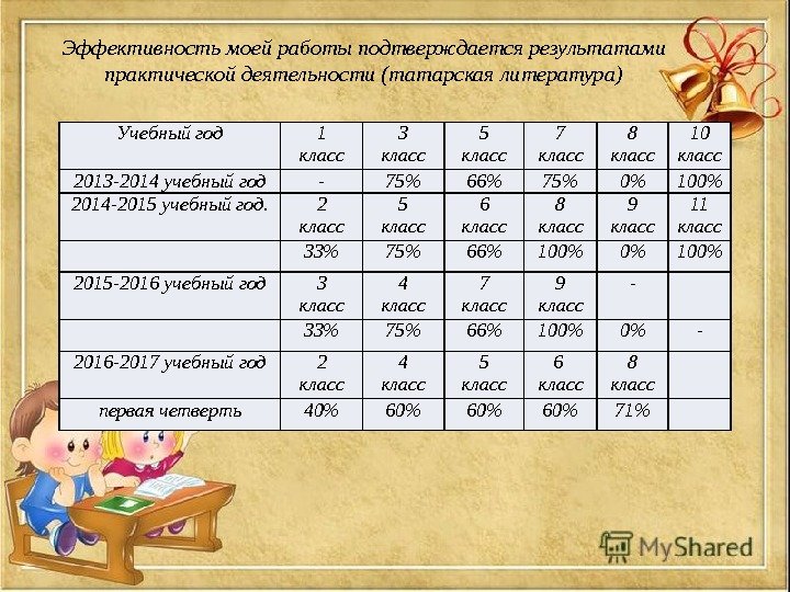 Эффективность моей работы подтверждается результатами практической деятельности (татарская литература) Учебный год 1 класс 3 класс 5 класс 7 класс 8 класс 10 класс 2013 -2014 учебный год — 75% 66% 75% 0% 100% 2014 -2015 учебный год. 2 класс 5 класс 6 класс 8 класс 9 класс 11 класс 33% 75% 66% 100% 0% 100% 2015 -2016 учебный год 3 класс 4 класс 7 класс 9 класс — 33% 75% 66% 100% 0% — 2016 -2017 учебный год 2 класс 4 класс 5 класс 6 класс 8 класс первая четверть 40% 60% 60% 71%