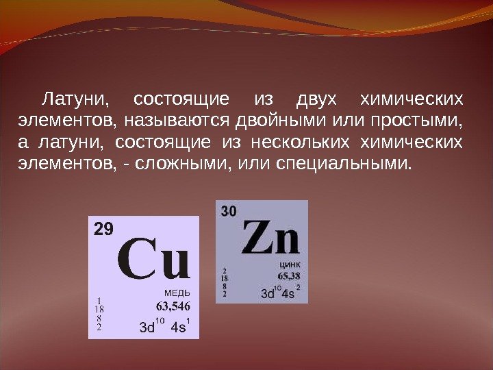 Латуни, состоящие из двух химических элементов, называются двойными или простыми, а латуни, состоящие из нескольких химических элементов, — сложными, или специальными.