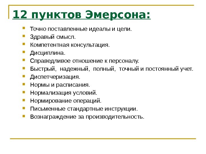 12 пунктов Эмерсона: Точно поставленные идеалы и цели. Здравый смысл. Компетентная консультация. Дисциплина. Справедливое отношение к персоналу. Быстрый, надежный, полный, точный и постоянный учет. Диспетчеризация. Нормы и расписания. Нормализация условий. Нормирование операций. Письменные стандартные инструкции. Вознаграждение за производительность.