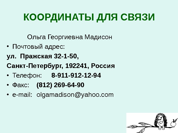 КООРДИНАТЫ ДЛЯ СВЯЗИ Ольга Георгиевна Мадисон • Почтовый адрес: ул. Пражская 32 -1 -50, Санкт-Петербург, 192241, Россия • Телефон: 8 -911 -912 -12 -94 • Факс: (812) 269 -64 -90 • e-mail: olgam а dison@yahoo. com