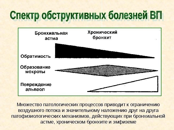 Множество патологических процессов приводит к ограничению воздушного потока и значительному наложению друг на друга патофизиологических механизмов, действующих при бронхиальной астме, хроническом бронхите и эмфиземе