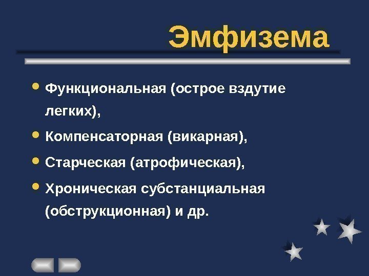 Эмфизема Функциональная (острое вздутие легких), Компенсаторная (викарная), Старческая (атрофическая), Хроническая субстанциальная (обструкционная) и др.