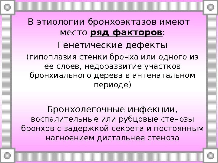 В этиологии бронхоэктазов имеют место ряд факторов : Генетические дефекты (гипоплазия стенки бронха или одного из ее слоев, недоразвитие участков бронхиального дерева в антенатальном периоде) Бронхолегочные инфекции, воспалительные или рубцовые стенозы бронхов с задержкой секрета и постоянным нагноением дистальнее стеноза