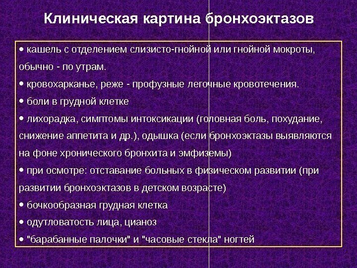 • кашель с отделением слизисто-гнойной или гнойной мокроты, обычно — по утрам. • кровохарканье, реже — профузные легочные кровотечения. • боли в грудной клетке • лихорадка, симптомы интоксикации (головная боль, похудание, снижение аппетита и др. ), одышка (если бронхоэктазы выявляются на фоне хронического бронхита и эмфиземы) • при осмотре: отставание больных в физическом развитии (при развитии бронхоэктазов в детском возрасте) • бочкообразная грудная клетка • одутловатость лица, цианоз • «барабанные палочки» и «часовые стекла» ногтей Клиническая картина бронхоэктазов