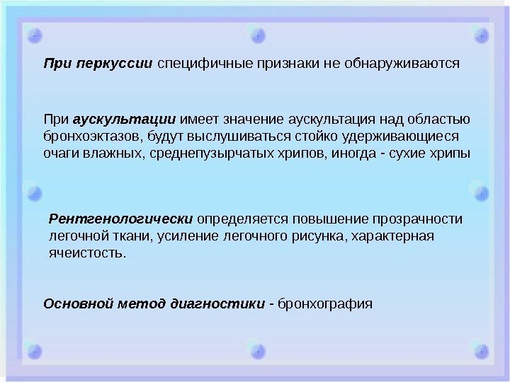 Рентгенологически определяется повышение прозрачности легочной ткани, усиление легочного рисунка, характерная ячеистость. При перкуссии специфичные признаки не обнаруживаются При аускультации имеет значение аускультация над областью бронхоэктазов, будут выслушиваться стойко удерживающиеся очаги влажных, среднепузырчатых хрипов, иногда — сухие хрипы Основной метод диагностики — бронхография