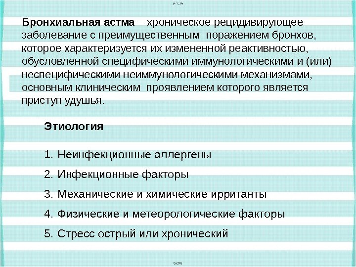 Бронхиальная астма – хроническое рецидивирующее заболевание с преимущественным поражением бронхов, которое характеризуется их измененной реактивностью, обусловленной специфическими иммунологическими и (или) неспецифическими неиммунологическими механизмами, основным клиническим проявлением которого является приступ удушья. Этиология 1. Неинфекционные аллергены 2. Инфекционные факторы 3. Механические и химические ирританты 4. Физические и метеорологические факторы 5. Стресс острый или хронический