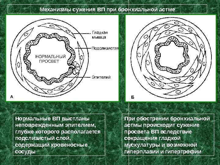 Механизмы сужения ВП при бронхиальной астме Нормальные ВП выстланы неповрежденным эпителием, глубже которого располагается подслизистый слой, содержащий кровеносные сосуды При обострении бронхиальной астмы происходит сужение просвета ВП вследствие сокращения гладкой мускулатуры и возможной гиперплазии и гипертрофии