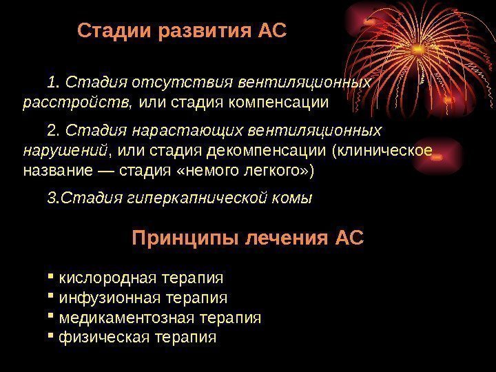 1. Стадия отсутствия вентиляционных расстройств, или стадия компенсации 2. Стадия нарастающих вентиляционных нарушений , или стадия декомпенсации (клиническое название — стадия «немого легкого» ) 3. Стадия гиперкапнической комы Стадии развития АС Принципы лечения АС кислородная терапия инфузионная терапия медикаментозная терапия физическая терапия