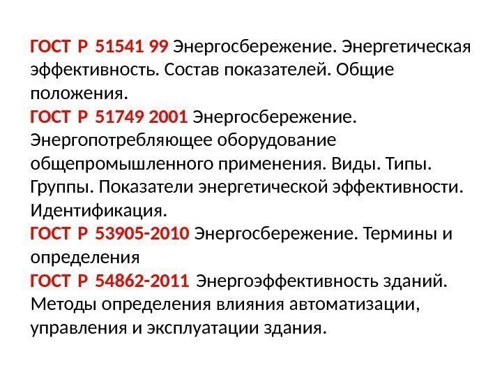 ГОСТ Р 51541 99 Энергосбережение. Энергетическая эффективность. Состав показателей. Общие положения. ГОСТ Р 51749 2001 Энергосбережение. Энергопотребляющее оборудование общепромышленного применения. Виды. Типы. Группы. Показатели энергетической эффективности. Идентификация. ГОСТ Р 53905 -2010 Энергосбережение. Термины и определения ГОСТ Р 54862 -2011 Энергоэффективность зданий. Методы определения влияния автоматизации, управления и эксплуатации здания.