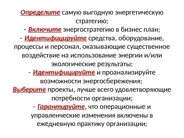 Определите самую выгодную энергетическую стратегию; — Включите энергостратегию в бизнес план; — Идентифицируйте средства, оборудование, процессы и персонал, оказывающие существенное воздействие на использование энергии и/или экологические результаты; — Идентифицируйте и проанализируйте возможности энергосбережения; Выберите проекты, лучше всего удовлетворяющие потребности организации; — Гарантируйте , что операционные и управленческие изменения включены в ежедневную практику организации;