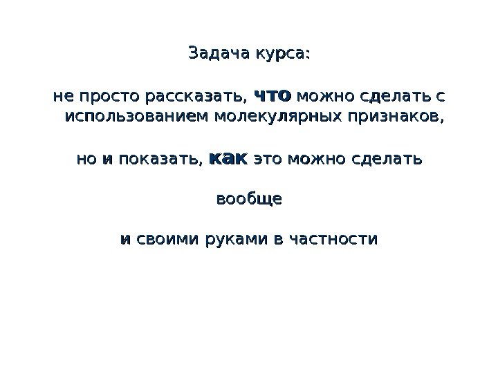 Задача курса: не просто рассказать, что можно сделать с использованием молекулярных признаков, но и показать, как это можно сделать вообще и своими руками в частности