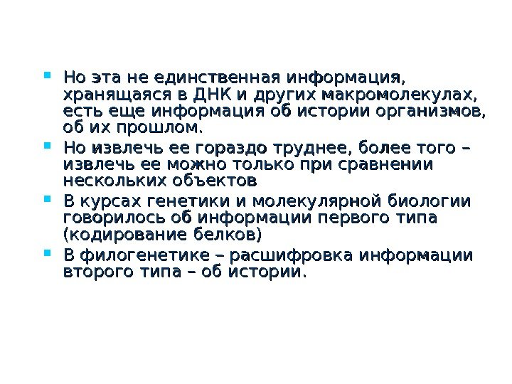 n n Но эта не единственная информация, хранящаяся в ДНК и других макромолекулах, есть еще информация об истории организмов, об их прошлом. Но извлечь ее гораздо труднее, более того – извлечь ее можно только при сравнении нескольких объектов В курсах генетики и молекулярной биологии говорилось об информации первого типа (кодирование белков) В филогенетике – расшифровка информации второго типа – об истории.