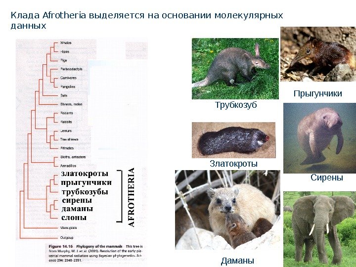 Клада Afrotheria выделяется на основании молекулярных данных Прыгунчики Трубкозуб Златокроты Сирены Даманы