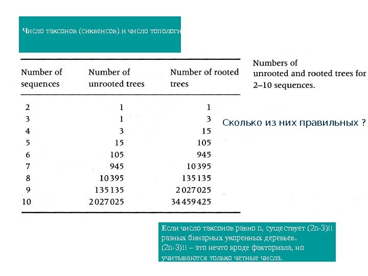 Число таксонов (сиквенсов) и число топологий, которые можно получить на их основе Сколько из них правильных ? Если число таксонов равно n, существует (2 n-3)!! разных бинарных укоренных деревьев. (2 n-3)!! – это нечто вроде факториала, но учитываются только четные числа.