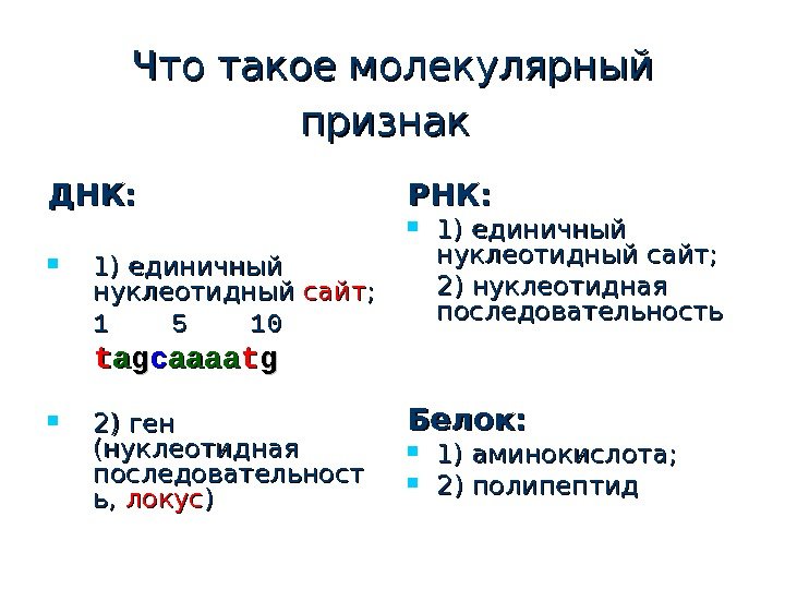 Что такое молекулярный признак ДНК: 1) единичный нуклеотидный сайт ; ; 1 5 10 tt aa gg cc aaaa tt gg 2) ген (нуклеотидная последовательност ь, ь, локус ) ) РНК: 1) единичный нуклеотидный сайт; 2) нуклеотидная последовательность Белок: 1) аминокислота; 2) полипептид