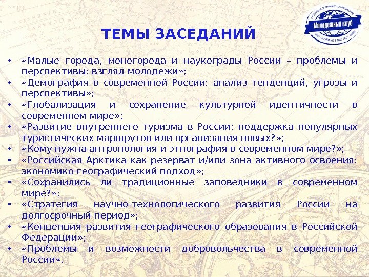 • «Малые города, моногорода и наукограды России – проблемы и перспективы: взгляд молодежи» ; • «Демография в современной России: анализ тенденций, угрозы и перспективы» ; • «Глобализация и сохранение культурной идентичности в современном мире» ; • «Развитие внутреннего туризма в России: поддержка популярных туристических маршрутов или организация новых? » ; • «Кому нужна антропология и этнография в современном мире? » ; • «Российская Арктика как резерват и/или зона активного освоения: экономико-географический подход» ; • «Сохранились ли традиционные заповедники в современном мире? » ; • «Стратегия научно-технологического развития России на долгосрочный период» ; • «Концепция развития географического образования в Российской Федерации» ; • «Проблемы и возможности добровольчества в современной России» . ТЕМЫ ЗАСЕДАНИЙ
