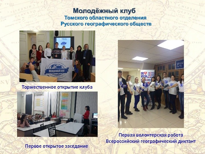 Торжественное открытие клуба Первая волонтерская работа Всероссийский географический диктант Первое открытое заседание