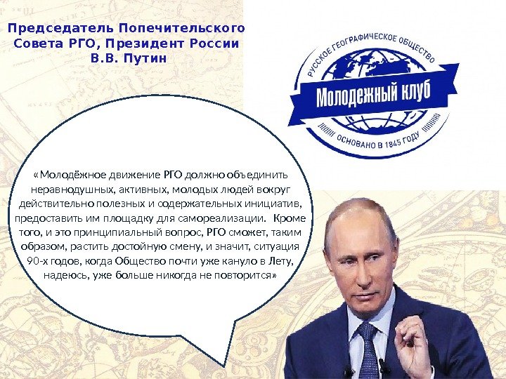 « Молодёжное движение РГО должно объединить неравнодушных, активных, молодых людей вокруг действительно полезных и содержательных инициатив, предоставить им площадку для самореализации. Кроме того, и это принципиальный вопрос, РГО сможет, таким образом, растить достойную смену, и значит, ситуация 90 -х годов, когда Общество почти уже кануло в Лету, надеюсь, уже больше никогда не повторится» Председатель Попечительского Совета РГО, Президент России В. В. Путин