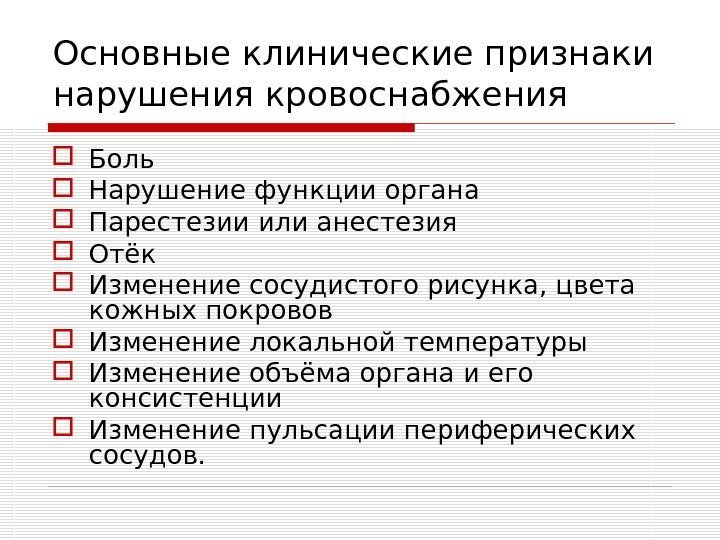 Основные клинические признаки нарушения кровоснабжения Боль Нарушение функции органа Парестезии или анестезия Отёк Изменение сосудистого рисунка, цвета кожных покровов Изменение локальной температуры Изменение объёма органа и его консистенции Изменение пульсации периферических сосудов.