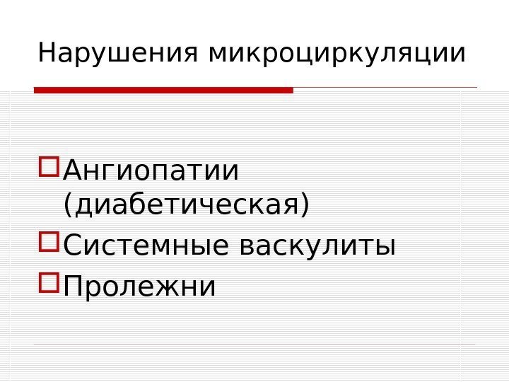 Нарушения микроциркуляции Ангиопатии (диабетическая) Системные васкулиты Пролежни