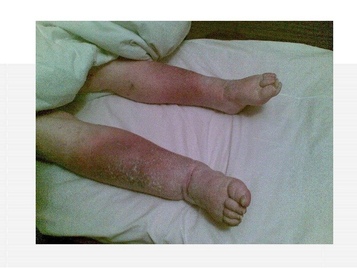 Клиническая картина Внезапное (как правило) появление ноющей боли в конечности; Боль усиливается при движении; Появляется прогрессирующий синюшный отёк; Появление расширенных, четко контурирующих, плотных поверхностных вен (при тромбофлебите); Резкая болезненность при пальпации сосудисто-нервного пучка (наиболее часто – при тромбофлебите).