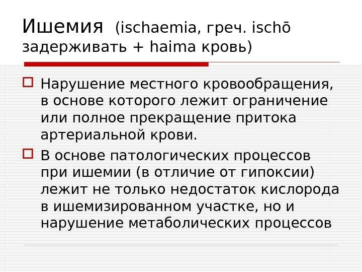 Ишемия (ischaemia, греч. ischō задерживать + haima кровь) Нарушение местного кровообращения, в основе которого лежит ограничение или полное прекращение притока артериальной крови. В основе патологических процессов при ишемии (в отличие от гипоксии) лежит не только недостаток кислорода в ишемизированном участке, но и нарушение метаболических процессов
