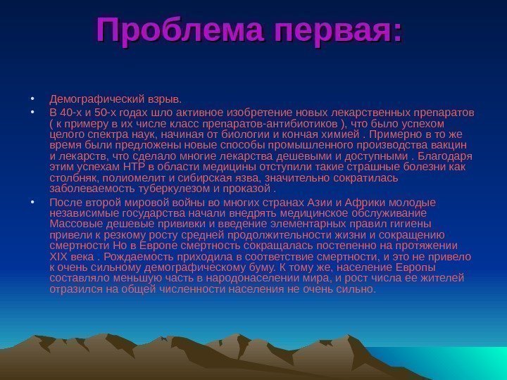 Проблема первая: • Демографический взрыв. • В 40 -х и 50 -х годах шло активное изобретение новых лекарственных препаратов ( к примеру в их числе класс препаратов-антибиотиков ), что было успехом целого спектра наук, начиная от биологии и кончая химией. Примерно в то же время были предложены новые способы промышленного производства вакцин и лекарств, что сделало многие лекарства дешевыми и доступными. Благодаря этим успехам НТР в области медицины отступили такие страшные болезни как столбняк, полиомелит и сибирская язва, значительно сократилась заболеваемость туберкулезом и проказой. • После второй мировой войны во многих странах Азии и Африки молодые независимые государства начали внедрять медицинское обслуживание Массовые дешевые прививки и введение элементарных правил гигиены привели к резкому росту средней продолжительности жизни и сокращению смертности Но в Европе смертность сокращалась постепенно на протяжении XIX века. Рождаемость приходила в соответствие смертности, и это не привело к очень сильному демографическому буму. К тому же, население Европы составляло меньшую часть в народонаселении мира, и рост числа ее жителей отразился на общей численности населения не очень сильно.