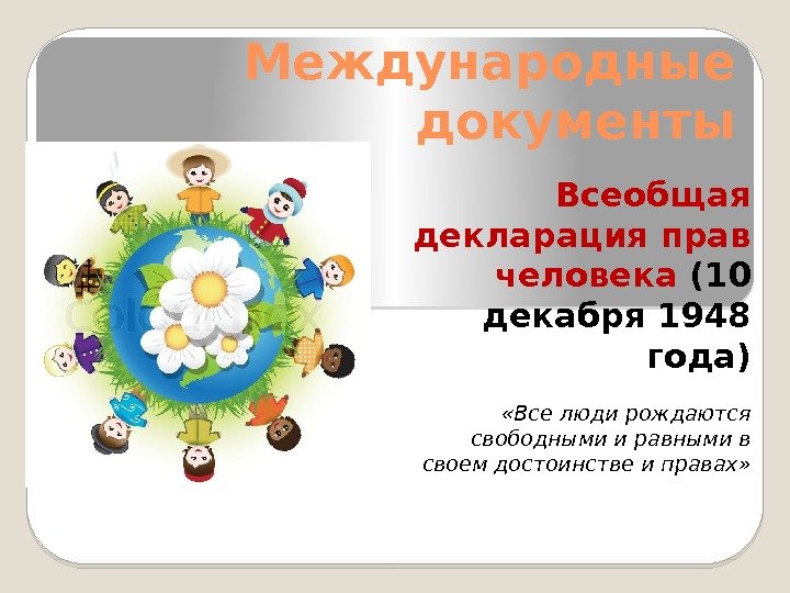Международные документы Всеобщая декларация прав человека (10 декабря 1948 года) «Все люди рождаются свободными и равными в своем достоинстве и правах»