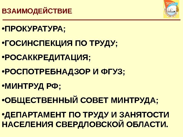 ВЗАИМОДЕЙСТВИЕ • ПРОКУРАТУРА; • ГОСИНСПЕКЦИЯ ПО ТРУДУ; • РОСАККРЕДИТАЦИЯ; • РОСПОТРЕБНАДЗОР И ФГУЗ; • МИНТРУД РФ; • ОБЩЕСТВЕННЫЙ СОВЕТ МИНТРУДА; • ДЕПАРТАМЕНТ ПО ТРУДУ И ЗАНЯТОСТИ НАСЕЛЕНИЯ СВЕРДЛОВСКОЙ ОБЛАСТИ.