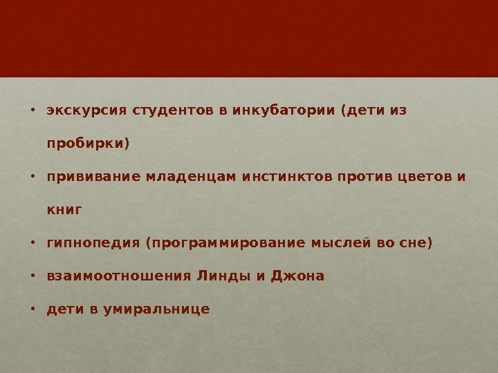 • экскурсия студентов в инкубатории (дети из пробирки) • прививание младенцам инстинктов против цветов и книг • гипнопедия (программирование мыслей во сне) • взаимоотношения Линды и Джона • дети в умиральнице