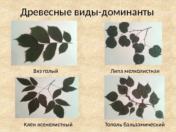Древесные виды-доминанты Вяз голый Липа мелколистная Клен ясенелистный Тополь бальзамический