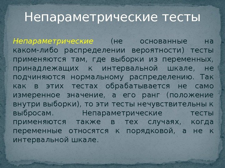Непараметрические (не основанные на каком-либо распределении вероятности) тесты применяются там, где выборки из переменных, принадлежащих к интервальной шкале, не подчиняются нормальному распределению. Так как в этих тестах обрабатывается не само измеренное значение, а его ранг (положение внутри выборки), то эти тесты нечувствительны к выбросам. Непараметрические тесты применяются также в тех случаях, когда переменные относятся к порядковой, а не к интервальной шкале. Непараметрические тесты