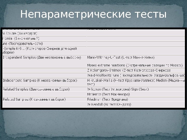 Наиболее часто применяемыми тестами являются тесты для сравнения двух и более независимых или зависимых выборок. Наиболее известными тестами, служащими для этих целей являются U-тест Манна-Уитни , Н-тест Крускала-Уоллиса , тест Уилкоксона и тест Фридмана. Важную роль также играет тест Колмогорова-Смирнова для одной выборки, который может применяться для проверки наличия нормального распределения. Непараметрические тесты могут , конечно, применяться и в случае нормального распределения значений. Но в этом случае они будут иметь лишь 95 %-ую эффективность по сравнению с параметрическими тестами. Если Вы хотите, к примеру, произвести множественное сравнение средних значений двух независимых выборок, причем выборки являются частично подчиняются нормальному распределению, а частично — нет, то рекомендуется всегда применять U-тест Манна и Уитни. Непараметрические тесты