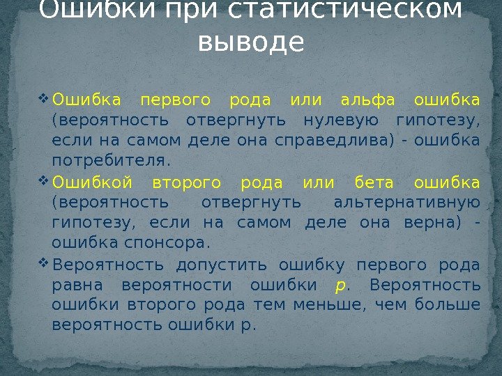Ошибка первого рода или альфа ошибка (вероятность отвергнуть нулевую гипотезу, если на самом деле она справедлива) — ошибка потребителя. Ошибкой второго рода или бета ошибка (вероятность отвергнуть альтернативную гипотезу, если на самом деле она верна) — ошибка спонсора. Вероятность допустить ошибку первого рода равна вероятности ошибки р. Вероятность ошибки второго рода тем меньше, чем больше вероятность ошибки р. Ошибки при статистическом выводе