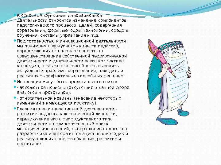 К основным функциям инновационной деятельности относится изменение компонентов педагогического процесса: целей, содержания образования, форм, методов, технологий, средств обучения, системы управления и т. д. Под готовностью к инновационной деятельности мы понимаем совокупность качеств педагога, определяющих его направленность на совершенствование собственной педагогической деятельности и деятельности всего коллектива колледжа, а также его способность выявлять актуальные проблемы образования, находить и реализовать эффективные способы их решения. Инновации могут быть представлены в виде: · абсолютной новизны (отсутствие в данной сфере аналогов и прототипов); · относительной новизны (внесение некоторых изменений в имеющуюся практику). Главная цель инновационной деятельности — развитие педагога как творческой личности, переключение его с репродуктивного типа деятельности на самостоятельный поиск методических решений, превращение педагога в разработчика и автора инновационных методик и реализующих их средств обучения, развития и воспитания.