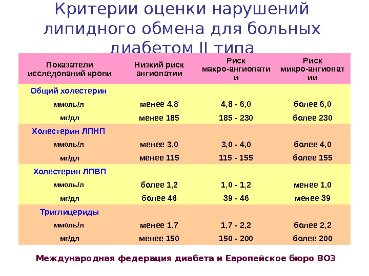 Критерии оценки нарушений липидного обмена для больных диабетом II типа Показатели исследований крови Низкий риск ангиопатии Риск макро-ангиопати и Риск микро-ангиопат ии Общий холестерин ммоль/л менее 4, 8 — 6, 0 более 6, 0 мг/дл менее 185 — 230 более 230 Холестерин ЛПНП ммоль/л менее 3, 0 — 4, 0 более 4, 0 мг/дл менее 115 — 155 более 155 Холестерин ЛПВП ммоль/л более 1, 2 1, 0 — 1, 2 менее 1, 0 мг/дл более 46 39 — 46 менее 39 Триглицериды ммоль/л менее 1, 7 — 2, 2 более 2, 2 мг/дл менее 150 — 200 более 200 Международная федерация диабета и Европейское бюро ВОЗ