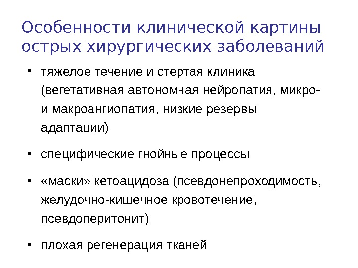 Особенности клинической картины острых хирургических заболеваний • тяжелое течение и стертая клиника (вегетативная автономная нейропатия, микро- и макроангиопатия, низкие резервы адаптации) • специфические гнойные процессы • «маски» кетоацидоза (псевдонепроходимость, желудочно-кишечное кровотечение, псевдоперитонит) • плохая регенерация тканей
