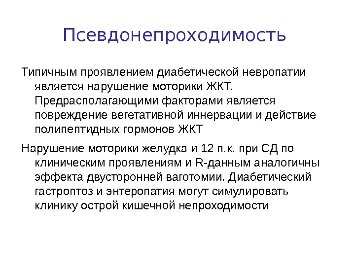 Псевдонепроходимость Типичным проявлением диабетической невропатии является нарушение моторики ЖКТ. Предрасполагающими факторами является повреждение вегетативной иннервации и действие полипептидных гормонов ЖКТ Нарушение моторики желудка и 12 п. к. при СД по клиническим проявлениям и R -данным аналогичны эффекта двусторонней ваготомии. Диабетический гастроптоз и энтеропатия могут симулировать клинику острой кишечной непроходимости