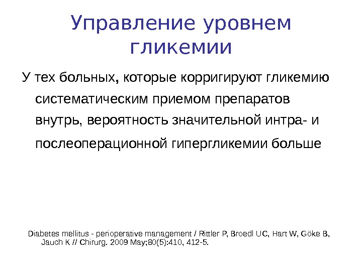 Управление уровнем гликемии У тех больных , которые корригируют гликемию систематическим приемом препаратов внутрь, вероятность значительной интра- и послеоперационной гипергликемии больше Diabetes mellitus — perioperative management / Rittler P, Broedl UC, Hart W, Göke B, Jauch K // Chirurg. 2009 May; 80(5): 410, 412 -5.