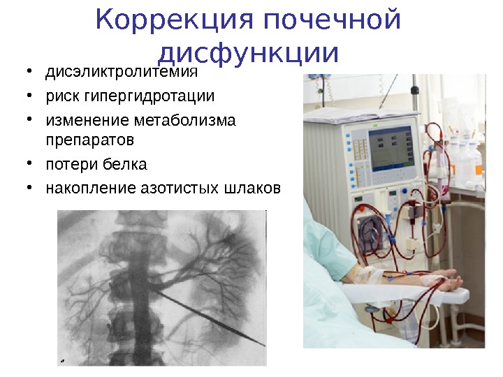 Коррекция почечной дисфункции • дисэликтролитемия • риск гипергидротации • изменение метаболизма препаратов • потери белка • накопление азотистых шлаков
