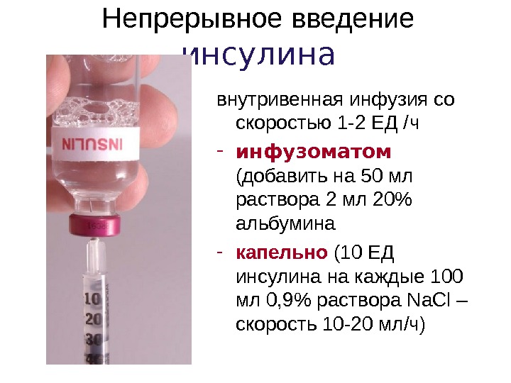 Непрерывное введение инсулина внутривенная инфузия со скоростью 1 -2 ЕД / ч — инфузоматом (добавить на 50 мл раствора 2 мл 20% альбумина — капельно (10 ЕД инсулина на каждые 100 мл 0, 9% раствора Na. Cl – скорость 10 -20 мл/ч )