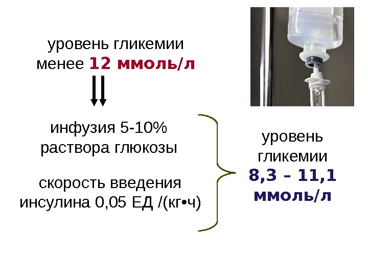 уровень гликемии менее 12 ммоль/л инфузия 5 -10% раствора глюкозы скорость введения инсулина 0, 05 ЕД /(кг • ч) уровень гликемии 8, 3 – 11, 1 ммоль/л
