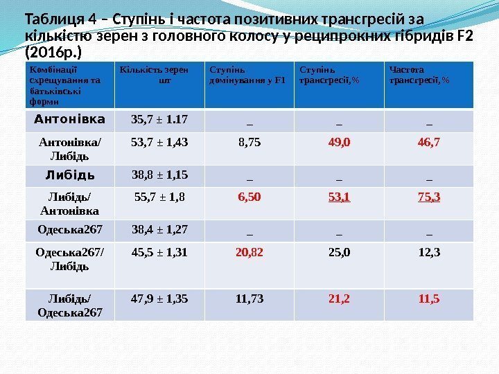 Таблиця 4 – Ступінь і частота позитивних трансгресій за кількістю зерен з головного колосу у реципрокних гібридів F 2 (2016 р. ) Комбінації схрещування та батьківські форми Кількість зерен шт Ступінь домінування у F 1 Ступінь трансгресії, % Частота трансгресії, % Антонівка 35, 7 ± 1. 17 _ _ _ Антонівка/ Либідь 53, 7 ± 1, 43 8, 75 49, 0 46, 7 Либідь 38, 8 ± 1, 15 _ _ _ Либідь/ Антонівка 55, 7 ± 1, 8 6, 50 53, 1 75, 3 Одеська 267 38, 4 ± 1, 27 _ _ _ Одеська 267/ Либідь 45, 5 ± 1, 31 20, 82 25, 0 12, 3 Либідь/ Одеська 267 47, 9 ± 1, 35 11, 73 21, 2 11,