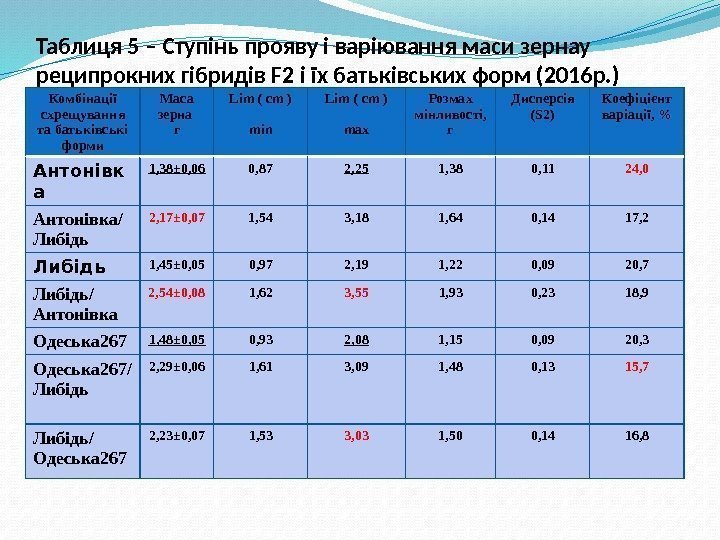 Таблиця 5 – Ступінь прояву і варіювання маси зернау реципрокних гібридів F 2 і їх батьківських форм (2016 р. ) Комбінації схрещування та батьківські форми Маса зерна г Lim ( cm ) min Lim ( cm ) max Розмах мінливості, г Дисперсія (S 2) Коефіцієнт варіації, % Антонівк а 1, 38 ± 0, 06 0, 87 2, 25 1, 38 0, 11 24, 0 Антонівка/ Либідь 2, 17 ± 0, 07 1, 54 3, 18 1, 64 0, 14 17, 2 Либідь 1, 45 ± 0, 05 0, 97 2, 19 1, 22 0, 09 20, 7 Либідь/ Антонівка 2, 54 ± 0, 08 1, 62 3, 55 1, 93 0, 23 18, 9 Одеська 267 1, 48 ± 0, 05 0, 93 2, 08 1, 15 0, 09 20, 3 Одеська 267/ Либідь 2, 29 ± 0, 06 1, 61 3, 09 1, 48 0, 13 15, 7 Либідь/ Одеська 267 2, 23 ± 0, 07 1, 53 3, 03 1, 50 0, 14 16,