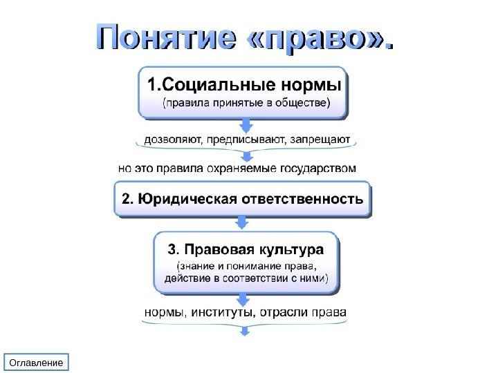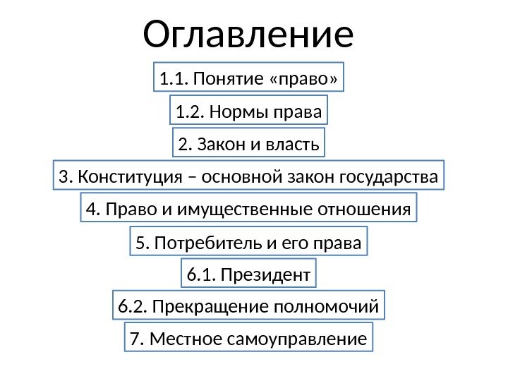 Оглавление 1. 1. Понятие «право» 1. 2. Нормы права 2. Закон и власть 3. Конституция – основной закон государства 4. Право и имущественные отношения 5. Потребитель и его права 6. 1. Президент 6. 2. Прекращение полномочий 7. Местное самоуправление