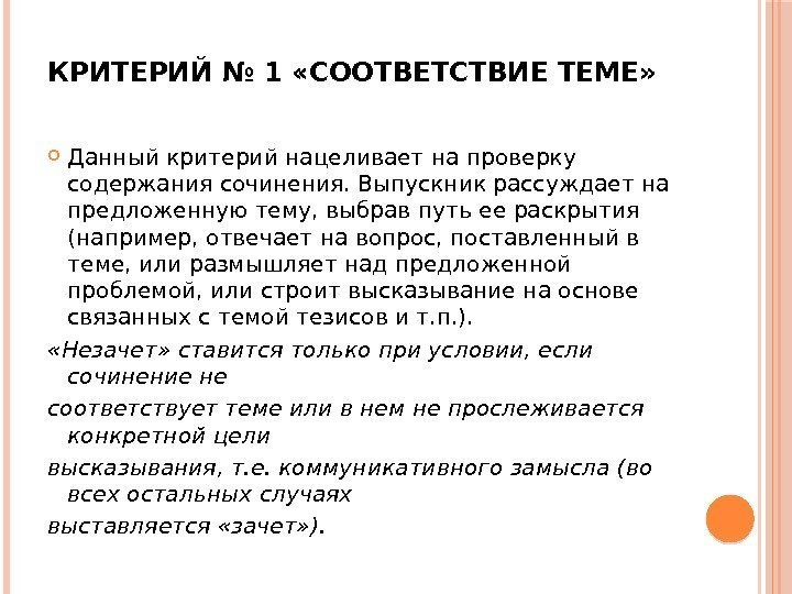 КРИТЕРИЙ № 1 «СООТВЕТСТВИЕ ТЕМЕ» Данный критерий нацеливает на проверку содержания сочинения. Выпускник рассуждает на предложенную тему, выбрав путь ее раскрытия (например, отвечает на вопрос, поставленный в теме, или размышляет над предложенной проблемой, или строит высказывание на основе связанных с темой тезисов и т. п. ). «Незачет» ставится только при условии, если сочинение не соответствует теме или в нем не прослеживается конкретной цели высказывания, т. е. коммуникативного замысла (во всех остальных случаях выставляется «зачет» ).