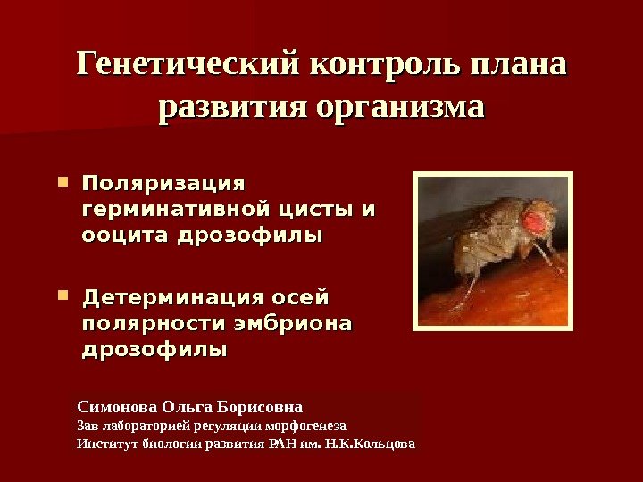 Поляризация герминативной цисты и ооцита дрозофилы Детерминация осей полярности эмбриона дрозофилы. Генетический контроль плана развития организма Симонова Ольга Борисовна Зав лабораторией регуляции морфогенеза Институт биологии развития РАН им. Н. К. Кольцова